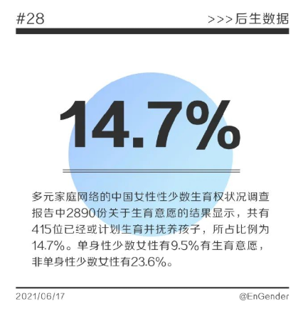 根据“多元家庭网络”的中国女性性少数生育权状况调查报告(初期结果),在关于“生育意愿”的 2,890 份调查中,共有 415 位受访者已经或计划生育并抚养孩子,所占比例为 14.7%。