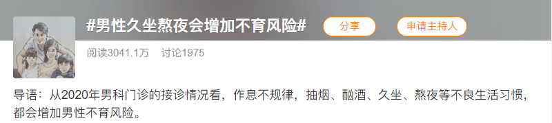 从2023年男科门诊的接诊情况看,生活作息不规律,抽烟、酗酒、久坐、熬夜等不良生活习惯,都会增加男性不育风险,70%的男性会有熬夜的习惯,主要是受到了经济或者工作上的压力,不得不面临着熬夜加班,男性长期熬夜不仅会对皮肤、肝脏带来损害,而且也会影响生育。