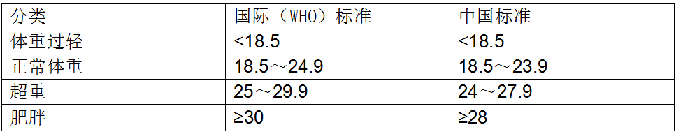 肥胖是指有损健康的不正常或过多的脂肪积累。肥胖最常用的诊断标准是体重指数(BMI)。计算公式:BMI=体重(Kg)/身高(m)2。